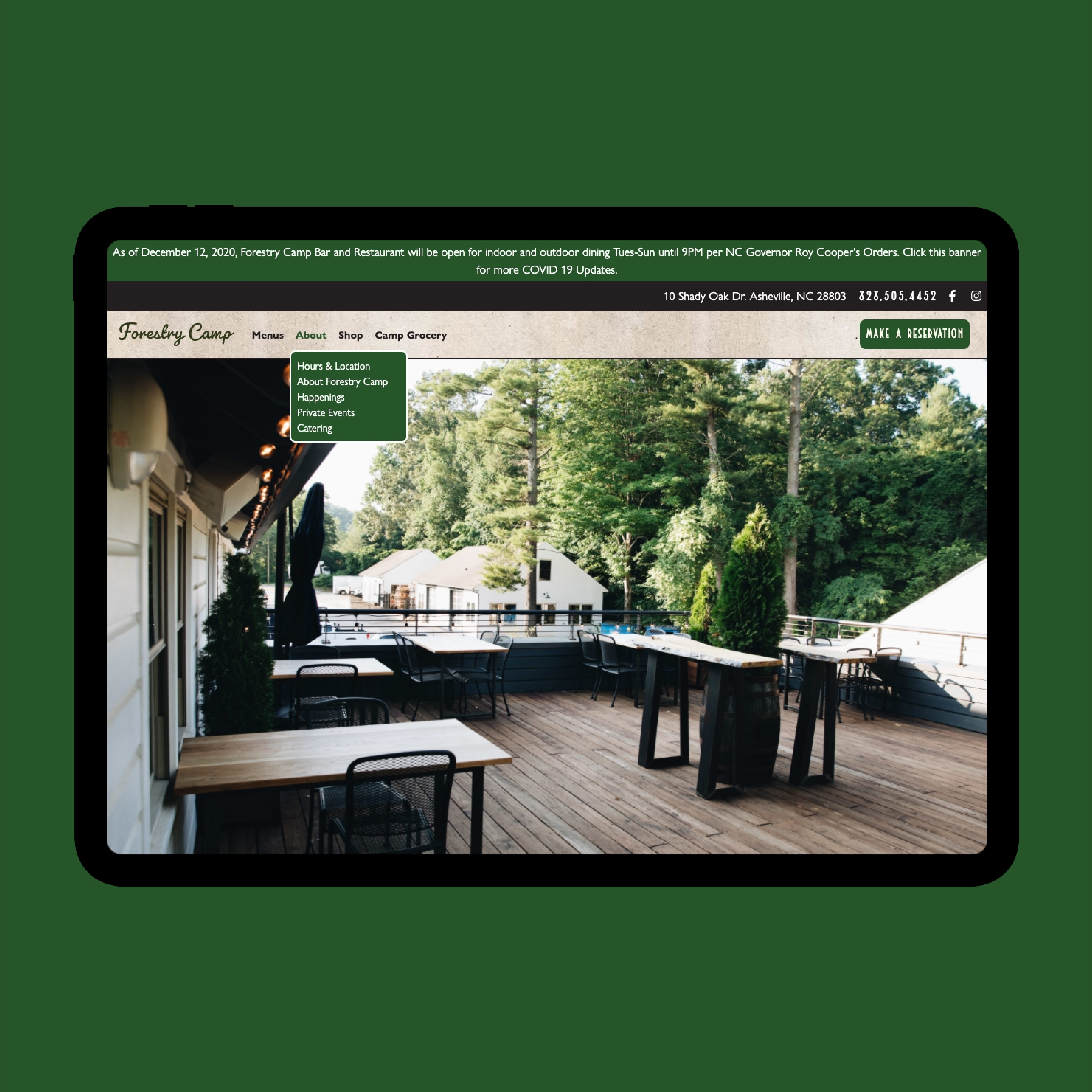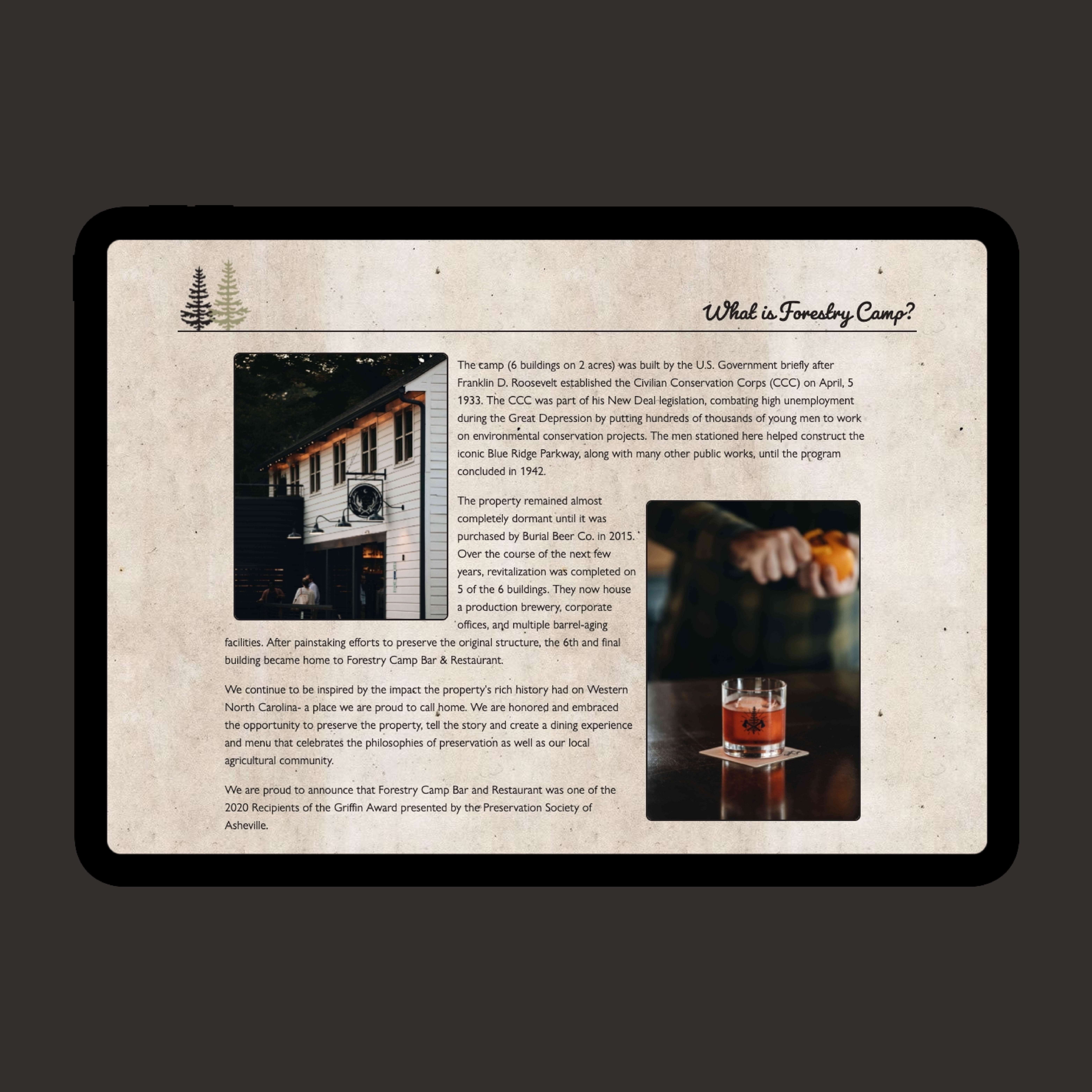 I started working with Forestry Camp in the summer of 2019. I lead the prototyping and design of their grand opening website and then built a Craft CMS based site using Tailwind CSS and Alpine JS. While the site was in development, I also designed a physical menu system for their indoor dining service and other various marketing materials including business cards, greeting cards, and signage. Since the start of the pandemic, I have also built out QR code-based digital menus and a new streamlined homepage experience for Forestry Camp.