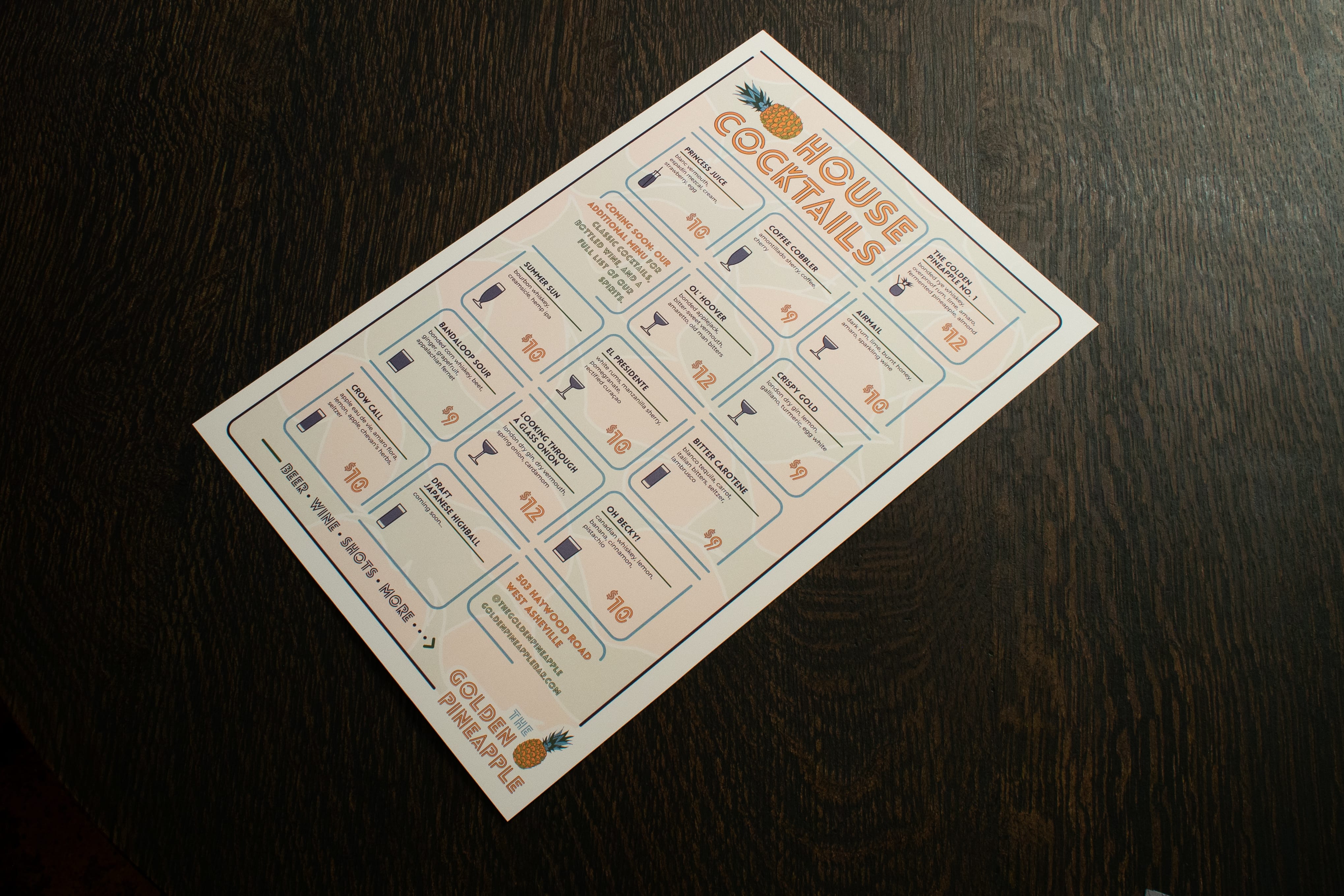 The Golden Pineapple opened in Asheville, NC during the spring of 2019. A year earlier, the owners approached my team to design a striking identity package for their bar, assist in the layout of their physical space, and create an easy to edit- information dense menu system. It quickly became a favorite of locals and visitors alike.